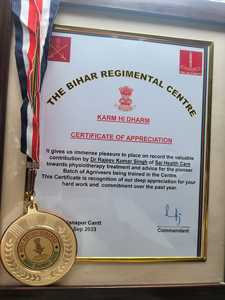 September 11, 2023पटना : देश के जाने माने फिजियोथेरेपिस्ट व साईं हेल्थ केयर वेलनेस सेंटर पटना के निदेशक डॉ राजीव कुमार सिंह को चिकित्सा के क्षेत्र में उनके द्वारा किये गए उत्कृष्ट कार्यो के लिए बिहार रेजिमेंट सेंटर द्वारा स्वर्ण पदक से सम्मानित किया गया। डॉ राजीव को ये सम्मान बिहार रेजिमेंट सेंटर दानापुर में विश्व फिजियोथेरेपी दिवस के अवसर पर आयोजित एक भव्य समारोह के दौरान दिया गया। इस सम्मान उन्हें बिहार रेजीमेंट सेंटर दानापुर के सेंटर हेड ब्रिगेडियर जसपाल के हाथों फिजियोथेरेपी चिकित्सा के क्षेत्र में बेहतर कार्य करने के लिए मिला।