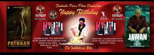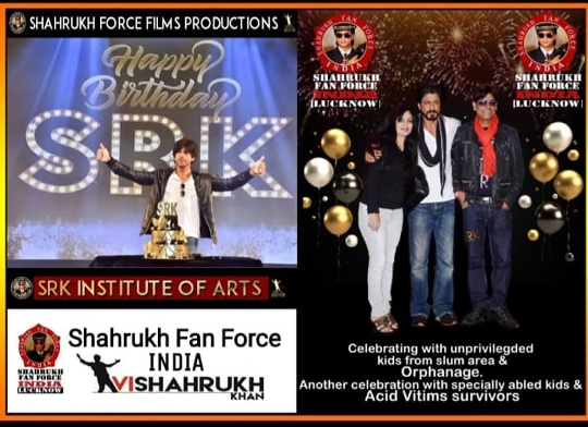 November 3, 2022लखनऊ में शाहरुख फैन फोर्स के प्रेसिडेंट विशाल सिंह उर्फ विशाहरुख ने आज शाहरुख खान के जन्मदिन के अवसर पर सभी फैंस की तरफ से अनोखे तरीके से जन्मदिन मनाया । सबसे पहले सहारा स्टेट स्थित जयति भारतम् दिव्यांगजन संस्था में जाकर विशाहरुख ने अपनी पत्नी रुचि खान बेटी सिमरन और बेटे आर्यन के साथ केक काटकर तकरीबन 30 दिव्यांगजनों के बीच खाने-पीने की सामग्री वितरित कर जन्मदिन मनाया। उसके बाद मूकबधिर बच्चों के स्कूल जाकर शिखा सिंह के साथ केक सभी बच्चों से कटवाकर मनाया l सब बच्चों को गिफ्ट देकर शाहरुख खान का जन्मदिवस बेहद खास तरह से मनाया और सभी दिव्यांगजनो और मूकबधिर बच्चों और स्टाफ ने शाहरुख खान की लंबी आयु के लिए प्रार्थना की ।