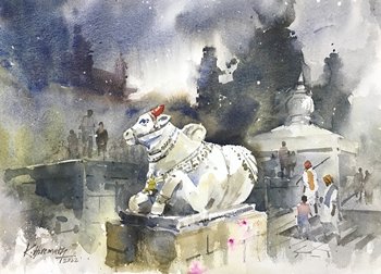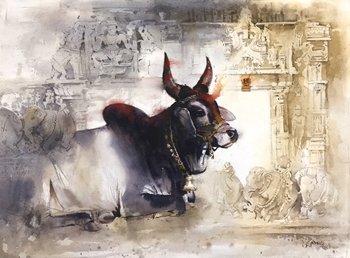 The emotions of this particular poem have stayed with me since then and thus the picturesque scenes of cattle outside temples, the Nandi inside the temple and bullocks dressed up for special festivities have always enchanted me. These beautiful scenes in real time have inspired my current exhibition “SIDHHA” connoting the meaning pure.