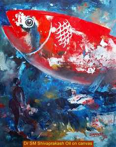 Dr. Shivaprakash, with his vast experience in art, education and travel explores the intimate connection between portraiture and the creative process by incorporating live demonstrations of art-making alongside a stunning collection of portraits. His experience in the fisheries department is reflected in his artworks that show an intersection of contemporary art and the animal kingdom. This collection showcases a diverse range of artistic perspectives and techniques, offering viewers a unique glimpse into the complex relationship between humans and animals in our rapidly changing world. It is a testament to the enduring allure of capturing the human spirit on canvas and the ever-evolving nature of artistic expression.
