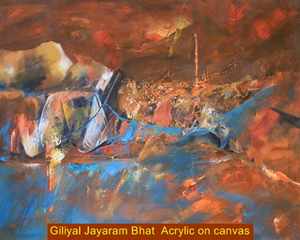 Giliyal Jayaram Bhat has been creating art for nearly four decades as industrialist and artist; and his style, approach and zest for the craft has evolved from portraits and landscapes that reflected formal training to intense abstraction of landscapes and moods that depict compositions of uninhibited freedom letting the elements interact within themselves in the pictorial plane, creating balances, imbalances, breathing spaces and a burgeoning of possibilities for viewer involvement and interpretation. The artist seems to effortlessly create ‘industrial poetry’ on surfaces, his works revealing the beauty hidden within the man-made, industrial environments, making us reconsider our perception of landscapes. In his latest series, one can observe the negative spaces being flipped to form relevant subjects that beckon the viewer’s time, easing them in and leaving remnants of peace in the viewer. He presents a world which reflects our inner world landscapes in a language of the formless from his lived experiences and observations.