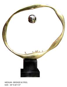 Pradip Mondal: Nature is the main composition of Pradip Mondal’s sculptures. He has BVA and MVA in Modelling and Sculpture from Govt. College of Art & Craft, Calcutta, where he teaches also. His sculptures represent the contouring base lines of nature. The linear metallic compositions are just simple in nature to express the transparency in objects of this phenomenal world. The lightness of heavy metal compositionally completes the surroundings.