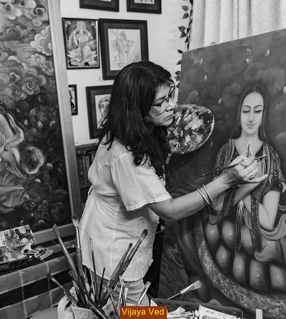 Vijaya Ved’s artwork embarks on a journey of self-illumination, where she delves into both the tangible and intangible aspects of human existence. Her art resonates with themes of self-awareness, spirituality, and the human connection to the infinite. By portraying the emotional and spiritual relationships in life, she transcends the physical limitations of the body, aiming to illuminate the boundless nature of the soul. Her evolution as an artist reflects a shift from depicting life’s emotional ties to a deeper immersion into self-exploration through nature, revealing a universal quest for inner enlightenment.