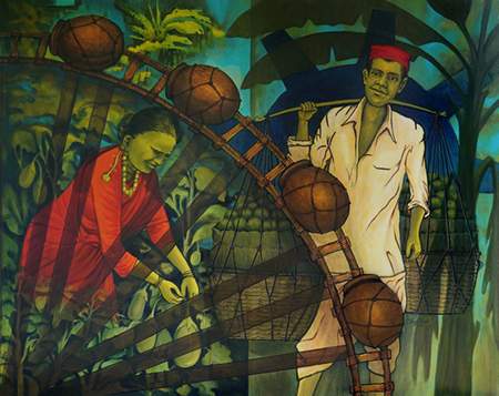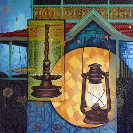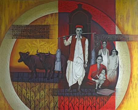 His present series is a visual narrative of societal life capturing the essence of everyday existence in rural areas around Vasai from attire to festivities to agricultural practices to the architecture of yesterday. He has been raised since yesteryears amidst the verdant landscapes of Vasai. Blessed with abundant natural beauty, Vasai has instilled in him a deep rooted admiration for nature since young age. He grew up in a family of farmers there and has happy good old memories of simplicity of life there. He was mesmerised by the traditional peculiarities in rural life such as flowers, lanterns, grinding wheels, rhythmic sound of rahata – old farming implement charm of ancestral homes with their simple yet intricate carvings with mangalore tiles on the top etc. Through his series, he has endeavoured to immortalize this heritage ensuring that it remains accessible to future generation. This series serves as a visual narrative of the simplicity of life in that picturesque area as a legacy of Vasai.
