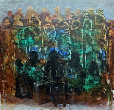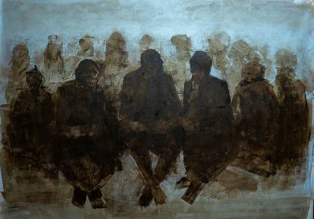Vishwa Sahni’s painting seems to have been focused for some time on the contention that abstraction, if allowed to breathe in a deeper pictorial space, can maintain visual opulence without drifting too far from its essentially two-dimensional syntax. Among a generation of artists who matured on this side of painting’s pluralist expansion, where each painter’s style, look and touch was far more varied than that of their predecessors, Sahni held to a firm figurative scaffold based on migration both perceived and imagined. Though the iconography in this recent work remains readable each painting’s horizon is still easy to find, there is in newer panels a softening of the edges and a swelling of forms that now shimmer behind translucent washes instead of bending, as they once did, into each other’s space. From an optimal distance coerced from the viewer by the five feet by nine feet spread of their frames their reconfigured cohesion seems to rely less on drawing and more on a spontaneous manipulation of hue and texture.